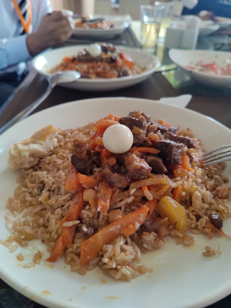 Firstly, the food is truly delicious! I had the Kazan kebab and a beetroot salad. The kebab was so tender, and everything was so flavorful, I finished the whole plate although it was a big portion. The salad was delicious, very fresh and lots of walnuts and the best part, only a little drizzle of mayonnaise. Most places put too much mayonnaise, but this one was perfect and still flavorful. The portions here are big, I was too full. I also took away the baked cheesecake, it was divine, very creamy and not too sweet. I'm so glad I came to fix my car at the mechanic close by, it's the best meal I've had in Tajikistan! Also very friendly and fast service. The environment is nice too, very beautifully set up with little water features. Highly recommend this restaurant!